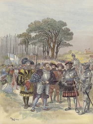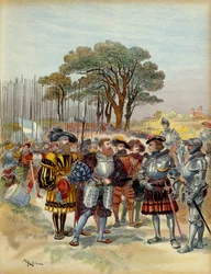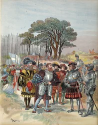 De Zwitsers eisen hun loon op in Bicocca, illustratie uit 'Francois Ier: Le Roi Chevalier, door George G. Toudouze, uitgegeven 1909(The Swiss demand their pay at Bicocca, illustration from 'Francois Ier: Le Roi Chevalier, by George G. Toudouze, pub. 1909 )Albert Robida |