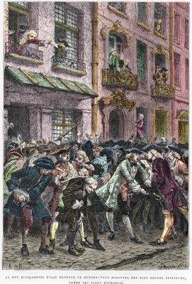Parijs IV arrondissement - La rue Quincampoix in 1720 ten tijde van het systeem van John Law - 'L'agiotage a la rue Quincampoix' (bankroet veroorzaakt door Law) - Uitzicht op de rue Quincampoix met de speculanten(Paris IV arrondissement - La rue Quincampoix en 1720 a l'epoque du système de John Law (1671 - 1729) - “” L'agiotage a la rue Quincampoix”” (bankruptcy causee by Law) - View of the rue Quincampoix with the speculators at the time of the system of John Law,)Anonymous Anonymous |
