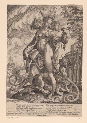 De godheid van Heresia, een allegorische figuur afgebeeld in de vorm van een vrouw met ezelsoren, die een boek met gescheurde bladzijden vasthoudt en een monsterlijk wezen tussen haar benen. Contrareformatorische satirische prent van Anton Eisenhout (1554-(The deity of Heresia, an allegorical figure depicted in the form of a woman with donkey ears, holding a book with torn pages and a monstrous creature between her legs. Counter-reformist satirical print by Anton Eisenhout (1554-1603) End of the 16th century)Anton Eisenhout |