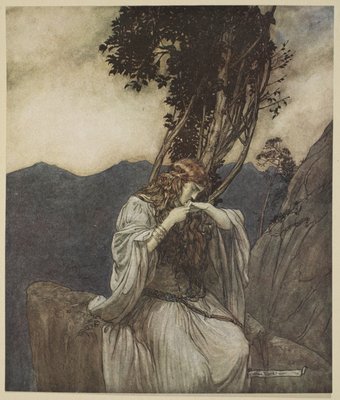 Brunnhilde kust de ring die Siegfried bij haar heeft achtergelaten, 1924('Brunnhilde kisses the ring that Siegfried has left with her', 1924. )Arthur Rackham |