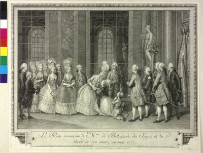 Koningin Marie Antoinette kondigt Madame de Bellegarde 1777 de vrijlating van haar echtgenoot aan(Queen Marie Antoinette annunciate Madame de Bellegarde 1777 the release of her spouse)Artist Unknown |