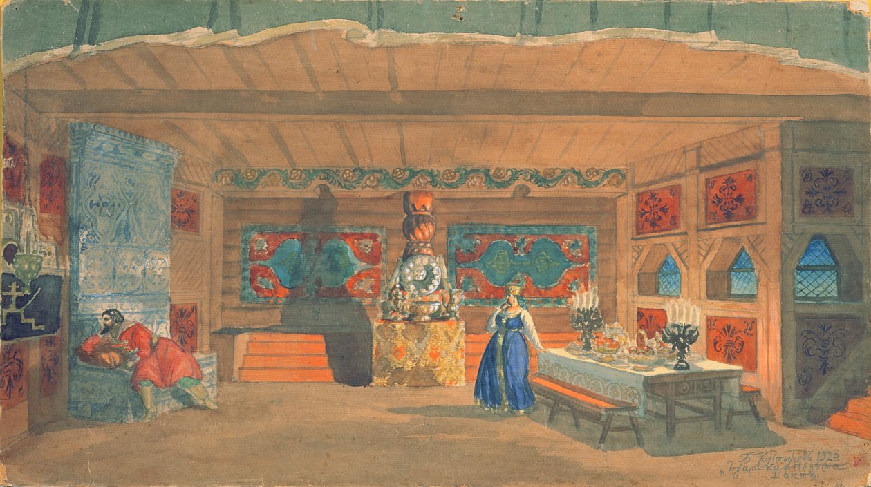 Toneelontwerp voor Rimsky-Korsakov's opera 'De Tsaar's bruid', 1920(Stage design for Rimsky-Korsakov's opera the 'The Tsar's bride', 1920 (wc und gouache on paper))Boris Mikhailovich Kustodiev |