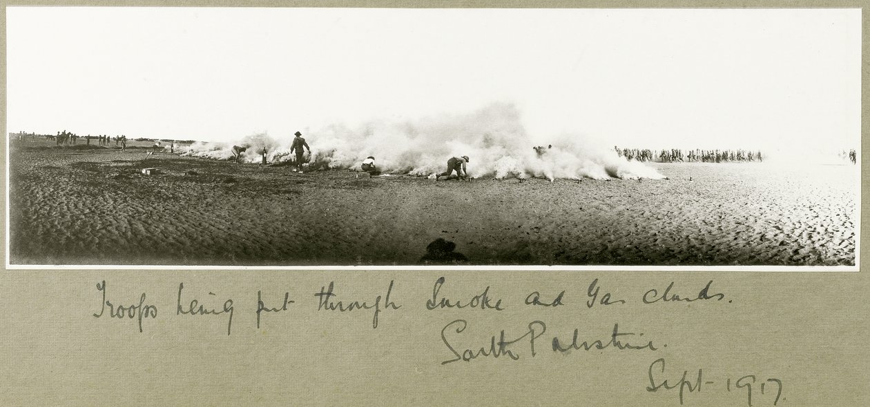 Troepen worden door rook en gaswolk geleid, Zuid-Palestina, september 1917(Troops being put through smoke and gas cloud, South Palestine, September 1917 )Capt. Arthur Rhodes |