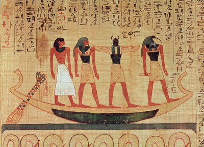 Papyrus met een man die door Thoth, Khepri en een andere god op een bark naar het hiernamaals wordt vervoerd(Papyrus depicting a man being transported on a barque to the afterlife by Thoth, Khepri and another god)Egyptian |