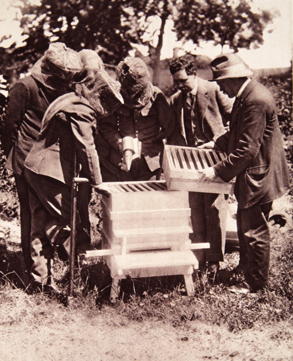 Bijenteelt instructie onder Lord Eglinton's plan: een gemaskerde klas bij de bijenkorven, uit The Illustrated War News, 5 juli 1916(Bee-keeping instruction under Lord Eglintons scheme: a masked class at the hives, from The Illustrated War News, 5th July 1916 (sepia photo))English Photographer |