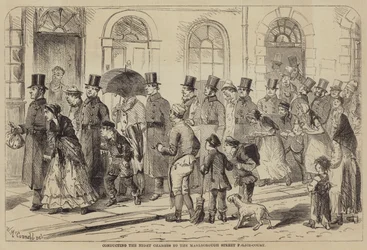 Het begeleiden van de nachtelijke arrestanten naar de Marlborough Street Police-Court (gravure)(Conducting the Night Charges to the Marlborough Street Police-Court (engraving))English School |