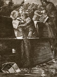 (Boston 'boys' disguised as Indians throwing the tea chests into the harbour, illustration from 'Cassell's Illustrated History of England' (engraving) (sepia photo))English School |
