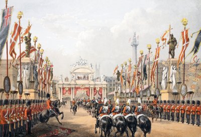 London Bridge, bewaakt door de Honourable Artillery Company of London, uit Een gedenkteken van het huwelijk van Edward VII en Alexandra van Denemarken, uitgegeven 1864(London Bridge, Kept by the Honourable Artillery Company of London, from A Memorial of the Marriage of Edward VII and Alexandra of Denmark, pub. 1864 )English School |