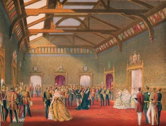 Het opstellen van de processie van de bruid in de centrale hal van de tijdelijke appartementen, uit A Memorial of the Marriage of Edward VII and Alexandra of Denmark, pub. 1864(Marshalling the procession of the Bride in the central hall of the temporary apartments, from A Memorial of the Marriage of Edward VII and Alexandra of Denmark, pub. 1864 )English School |