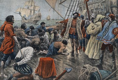 Illustratie van de bemanning van Ferdinand Magellaan die hun trouw aan hem zweren na een mislukte muiterij.(Illustration of the crew of Ferdinand de Magellan swearing their allegiance to him on a cross following an unsuccesful mutiny - Fernand de Magellan (1480-1521), Portuguese navigator soothes a sedition of his crew and after forgiving him makes him swear loy)Eugene Damblans |