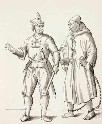 Zestiende-eeuwse galeisoldaat met een galeislaaf, c.1880(Sixteenth century Galley Soldier with a Galley Slave, c.1880)European School |