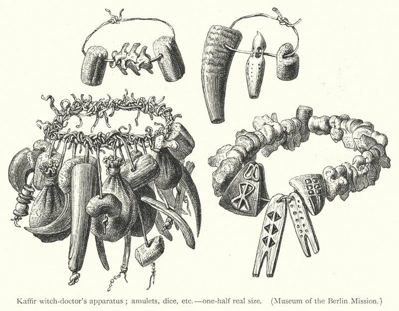 Apparatuur van een Kaffer-heksendokter(Kaffir witch-doctor's apparatus (engraving))European School |