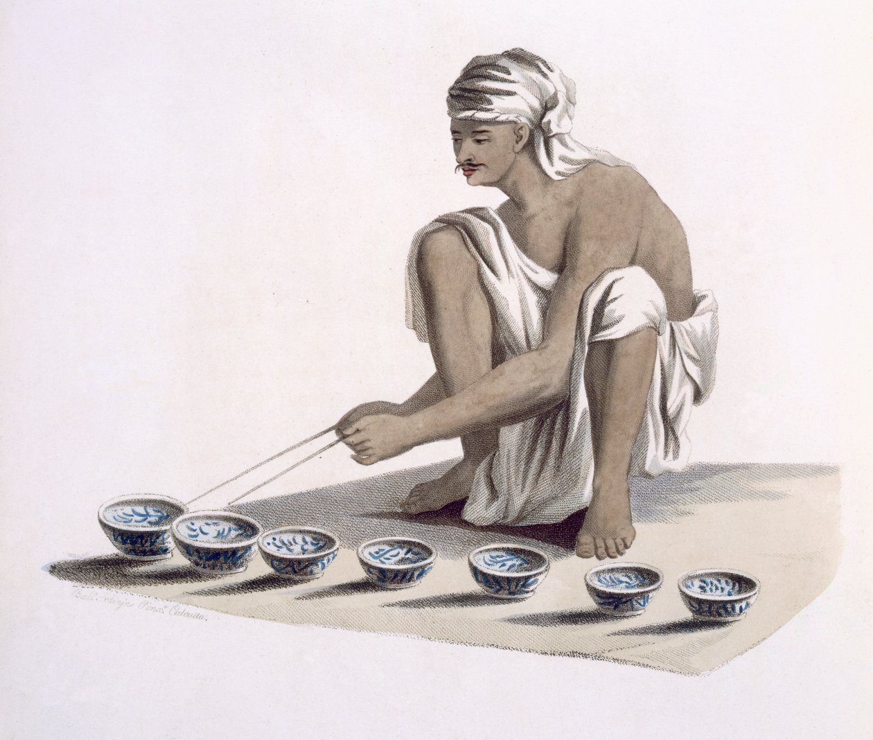 Jultrung: spelen op verschillende maten porseleinen kopjes om een harmonica-achtig geluid te produceren, uit 'Kostuums van India' door E. Orme, 1804(Jultrung: playing on different sized china cups to produce a harmonica-like sound, from 'Costumes of India' by E. Orme, 1804 (coloured etching))Franz Balthazar Solvyns |