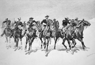 Amerikaanse Indianen vallen cowboys aan. Frederic Remington. Buffalo Soldiers in Achtervolging Afgestegen: de 4e Ruiters Bewegen, oorspronkelijk geschilderd in 1890 De Redding van Korporaal Scott tijdens de Geronimo-campagne van 1886 Vee in een maïs kraal in Kansas, illustratie uit Een Apache Verkenner. Frederic Remington. Een Sergeant van de Amerikaanse Cavalerie, naar een tekening van 1890 Luitenant S.C. Robertson, Hoofd van de Crow Scouts, naar een aquarel van 1890 Een Ontbijt van een Cavalerist op de Vlakte, naar een Olieverfschilderij c.1890 Amerikaanse Cavalerie Officier in veldtenue van de jaren 1870 De missionaris