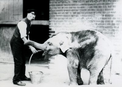 Jonge Afrikaanse olifant Kiberenge wordt gevoerd door Darisha terwijl Syed Ali toekijkt op de achtergrond, London Zoo, september 1923(Young African Elephant Kiberenge being fed by Darisha while Syed Ali looks on in the background, London Zoo, September 1923 (bw photo))Frederick William Bond |