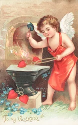 Wenskaart met een cherubijn die vriendschapspenningen maakt in een smederij (chromolitho)(Greetings card showing a cherub creating friendship tokens in a forge (chromolitho))French School |