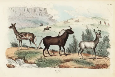 Zoogdieren, ca. 1860 Zwarte gnoe, Connochaetes gnou, ernstig bedreigde addax of schroefhoornantilope, Addax nasomaculatus, en harnasbosbok of kewel, Tragelaphus scriptus De Nyala Afrikaanse en Aziatische antilopen Zoogdieren, c.1860 Afrikaanse dieren Afrikaanse herkauwers van de savanne Buffel, geit, geit en steenbok - in Eland Nilgai Soorten antilopen Antilopen en gazellen Giraffe, gems en gazelle - in "Histoires naturelles des mammifères", uitgegeven door Schreiber Grote Kudu, 1863-79 Antilopen Wilde geit Kudu Afrikaanse Antilope Soorten Gnoe Wildebeest and Gemsbok Gemzen, gazellen, steenbokken en moeflons Een woestijn in Centraal-Azië De steenbok, de Syrische geit en de gemsantilope Gazelle Nilgai, 1863-79 Antilopen en gazellen Diverse antilopesoorten Grote koedoe