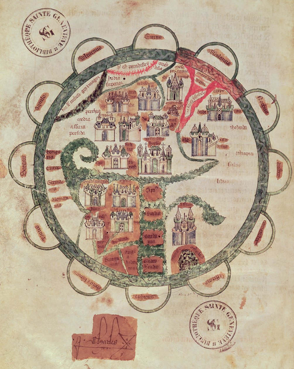 Ms 782 f.374v Wereldkaart met Jeruzalem in het midden, uit 'Chroniques de St. Denis', ca. 1275(Ms 782 f.374v World map with Jerusalem in the centre, from 'Chroniques de St. Denis', c.1275 )French School |