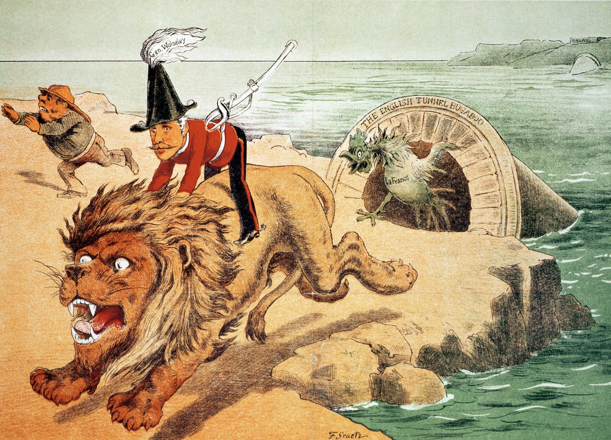 'De leeuw kan het kraaien van de haan niet verdragen', De Amerikaanse kijk op de Kanaaltunnelangst, illustratie uit 'Puck' magazine('The Lion cannot face the corwing of the Cock', The American view of the Channel Tunnel Scare, illustration from 'Puck' magazine )Friedrich Graetz |