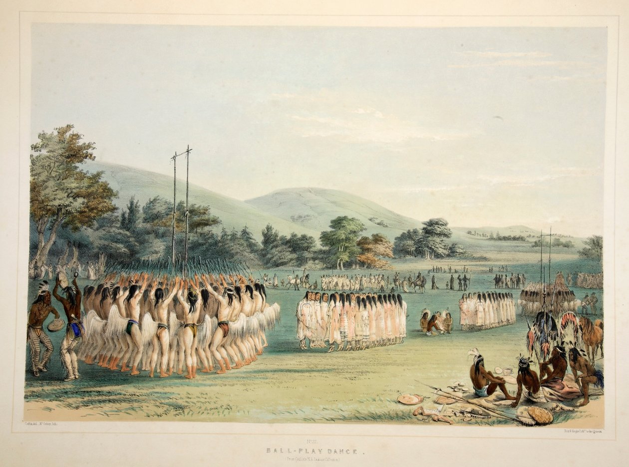 Balspeler Dans, pub. 1845 kleurenlithografie(Ball-Player Dance, pub. 1845 colour lithograph. )George Catlin |