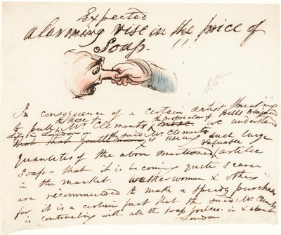"Verwacht - alarmerende stijging van de zeepprijs!"("Expected--alarming rise in the price of soap!")George Cruikshank |