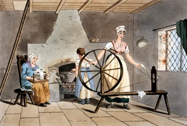 Vrouw aan het Spinnewiel, uit 'Kostuum van Yorkshire', gegraveerd door Robert Havell (1769-1832), 1814(Woman Spinning, from 'Costume of Yorkshire', engraved by Robert Havell (1769-1832), 1814 )George Walker |