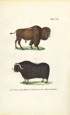 Natuurhistorische plaat: Zoologische plaat met de Buffel en de Bizon - in 'Complete Werken van Buffon' door natuuronderzoeker Georges Louis Leclerc, Graaf van Buffon (1707 - 1788). Gravure uit 1837(Natural history board: Zoological board representing 1. Buffalo and two. Le bison - in “” Works complete of Buffon”” by naturalist Georges Louis Leclerc, Count of Buffon (1707 - 1788). Engraving from 1837.)Georges-Louis Leclerc |
