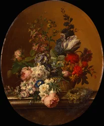 Stilleven van bloemen in een mand met een heggenmusnest op een stenen richel(Still Life of Flowers in a Basket with a Dunnock's Nest on a Stone Ledge (oil on canvas))Gerard van Spaendonck |