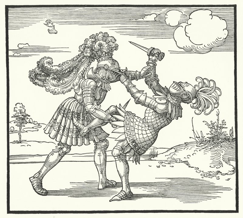 Twee ridders vechten te voet(Two knights fighting on foot (engraving))German School |