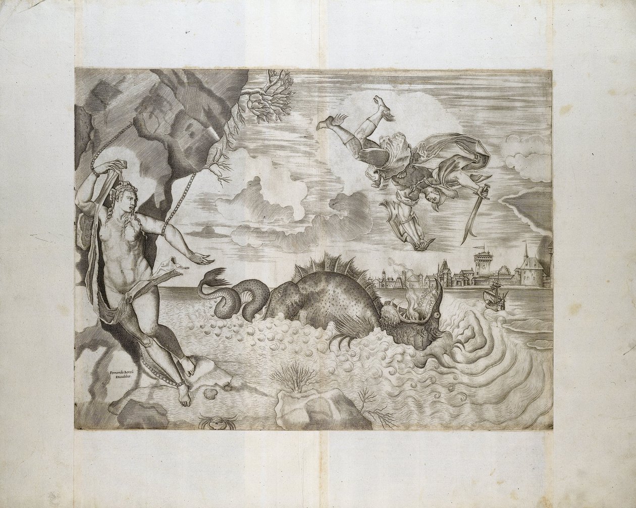 Perseus en Andromeda(Perseus and Andromeda)Giulio Sanuto(print maker),Titiaan(after painting by),Albrecht Dürer(after print by) |