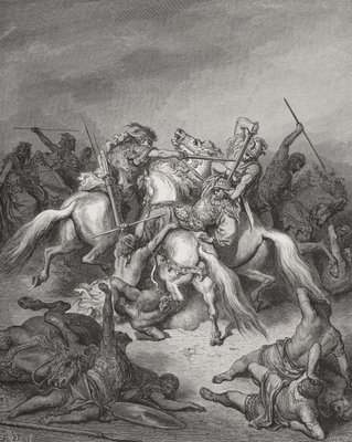 Abishai redt het leven van David, Samuel 2:17, illustratie uit Dore's 'De Heilige Bijbel', gegraveerd door Hurel(Abishai Saves the Life of David, Samuel 2:17, illustration from Dore's 'The Holy Bible', engraved by Hurel)Gustave (after) Dore |