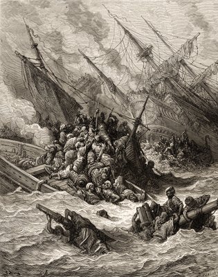 "De zeeslag van Lepanto" Het zette een Spaanse, Venetiaanse alliantie en pauselijke strijdkrachten op tegen de Ottomanen in 1571 voor de kust van Griekenland. Gravure van Gustave Dore (1832-1883) uit "De geschiedenis van de kruistochten" door Joseph Franco(“The Naval Battle of Lepanto” It set up a Spanish, Venetian alliance and Pope forces to the Ottomans in 1571 off Greece. Engraving by Gustave Dore (1832-1883) from “The History of the Crusades” by Joseph Francois Michaud)Gustave Dore |