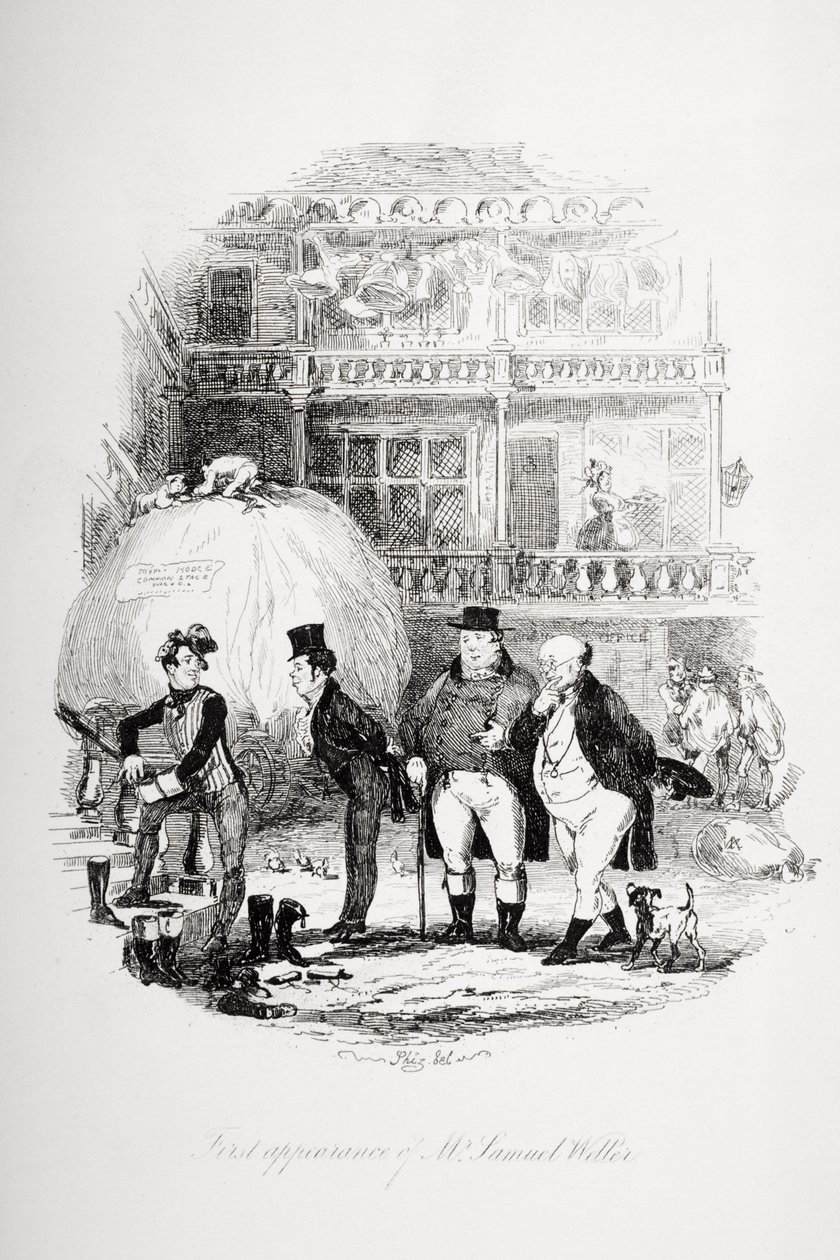 Eerste Verschijning van Mr. Samuel Weller, illustratie uit 'The Pickwick Papers' door Charles Dickens, gepubliceerd in 1837(First appearance of Mr. Samuel Weller, illustration from `The Pickwick Papers' by Charles Dickens (1812-70) published 1837 )Hablot Knight Browne |