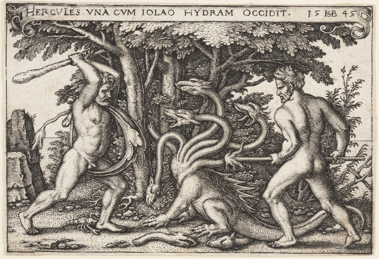 Hercules die de Hydra doodt(Hercules Slaying the Hydra)Hans Sebald Beham(Print Maker) |
