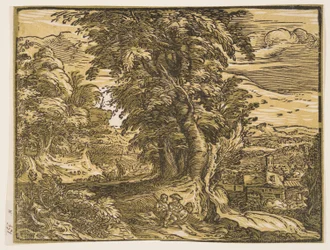chiaroscuro woodcut in ochre-sepia, olive and black
