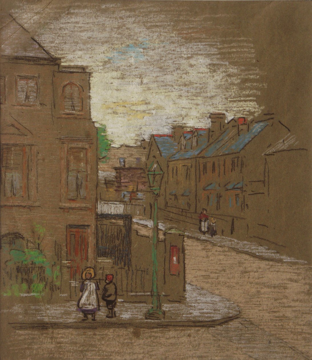 Kinderen wachtend op de hoek van een straat, circa 1900(Children waiting on the corner of a street, c.1900 (coloured chalk on brown paper))Horace Mann Livens |