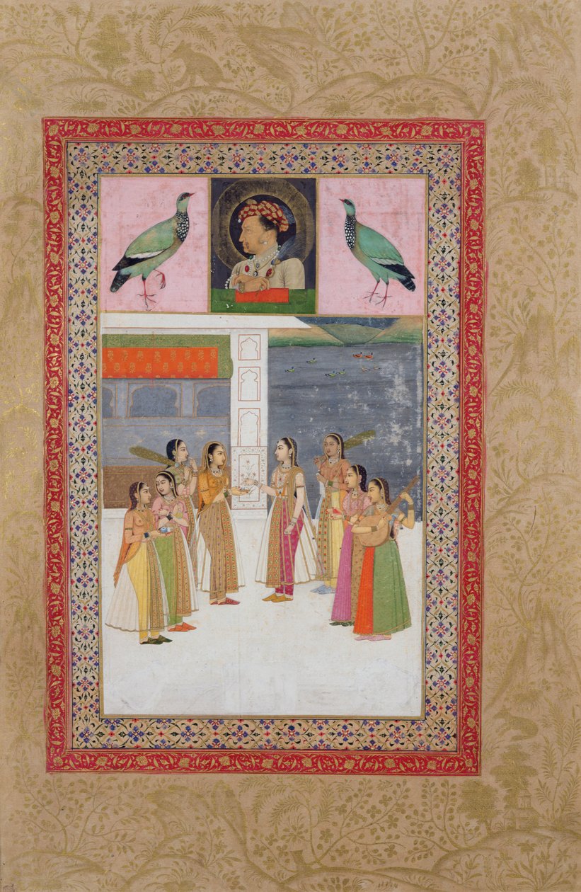 Ms E-14 Portret van Djahangir (1569-1627) twee vogels en edele vrouwen in gesprek(Ms E-14 Portrait of Djahangir (1569-1627) two birds and noble women in conversation )Indian School |