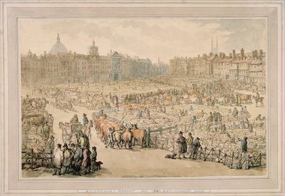 Vogelvlucht van Smithfield Market, genomen vanaf de Bear & Ragged Staff, 1 januari 1811(A Bird's Eye View of Smithfield Market, Taken from the Bear & Ragged Staff, Jan..., January 1, 1811. )J. Bluck |