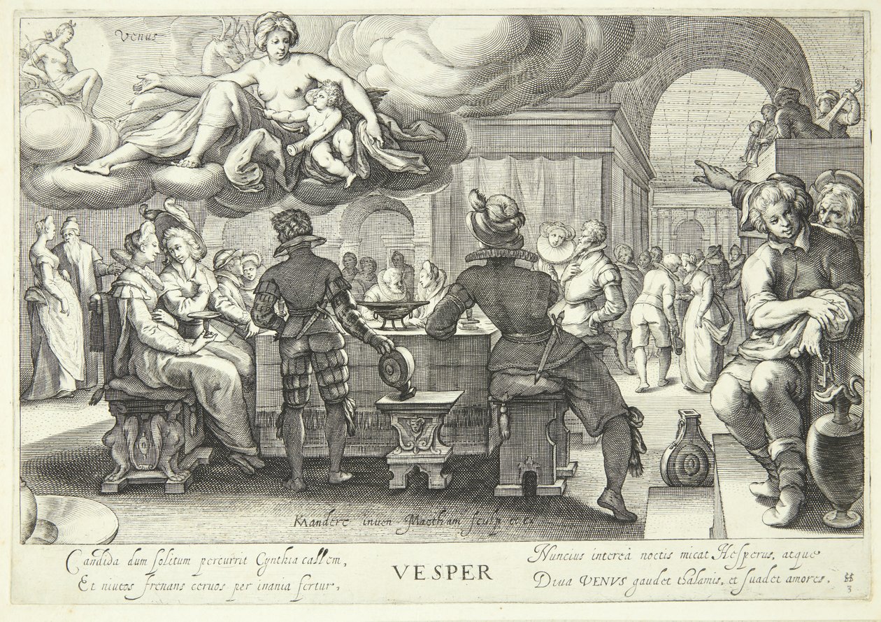 Avond, Venus' tijd(Aften, Venus' tid)Jacob Matham,Karel van Mander I(after model by),Jacob Matham(publisher) |