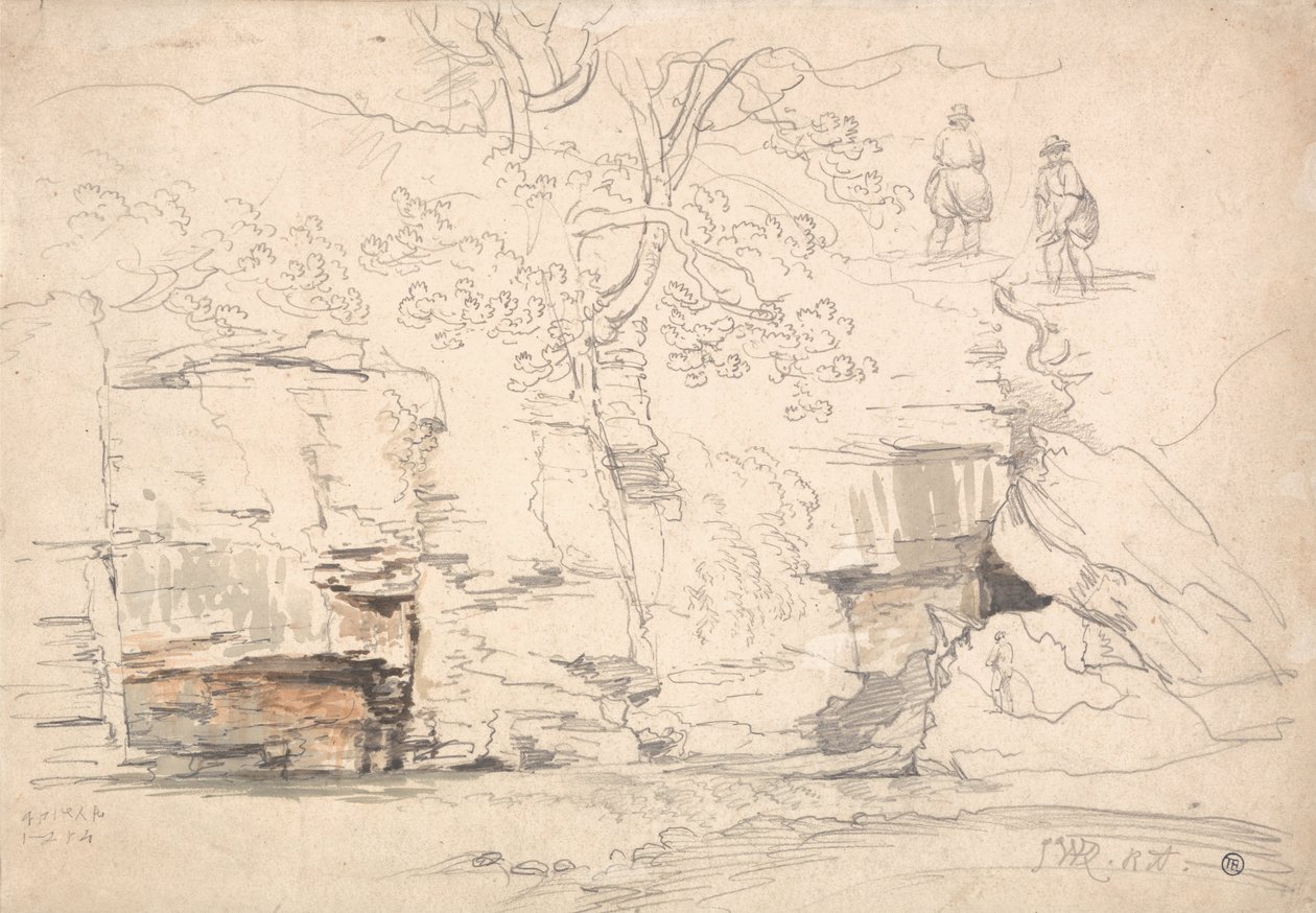 Een rotsachtige heuvel met bomen en figuren(A Rocky Hillside with Trees and Figures)James Ward |
