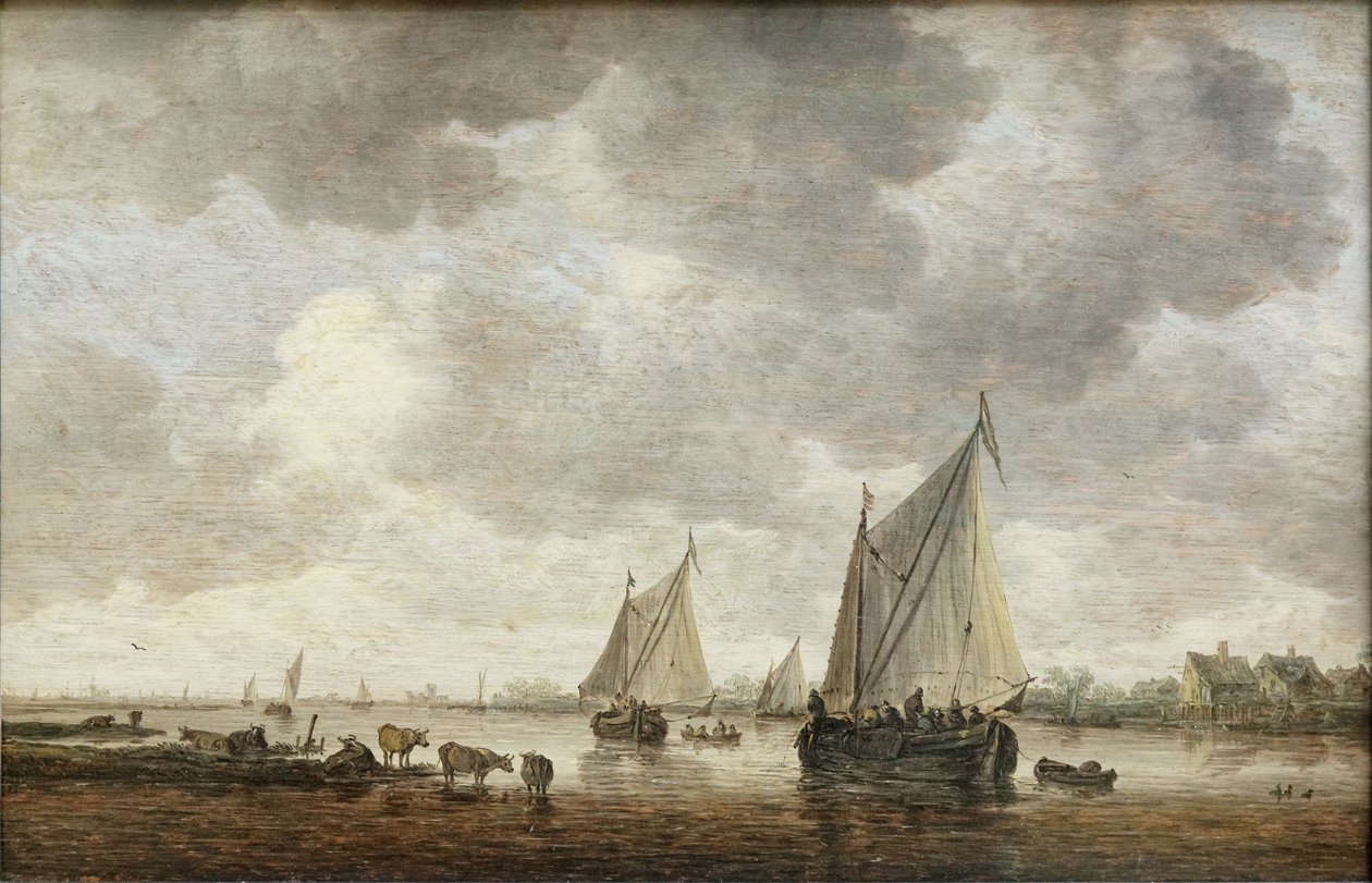 Twee grote zeilboten op een rivier en vee bij de oever(Deux grandes barques à voiles sur un fleuve et bestiaux près de la rive)Jan Josephsz van Goyen |