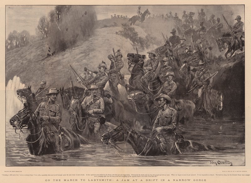 Op mars naar Ladysmith, een opstopping bij een drift in een smalle kloof(On the March to Ladysmith, a Jam at a Drift in a Narrow Gorge )John Charlton |