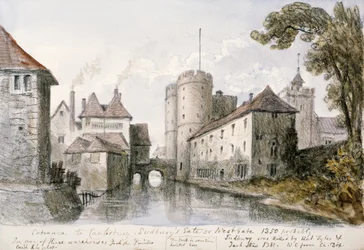Oude Huizen op Harnam Brug, Salisbury met het Oude Ziekenhuis van Sint Nicolaas, 1827(Old Houses on Harnam Bridge, Salisbury with the Ancient Hospital of Saint Nicholas, 1827)John Constable |