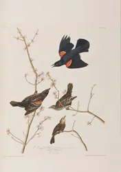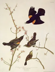 Roodvleugelspreeuw, uit 'Birds of America', gegraveerd door Robert Havell, gepubliceerd 1820(Red-winged Starling, from 'Birds of America', engraved by Robert Havell (1793-1878) published 1820 )John James Audubon |