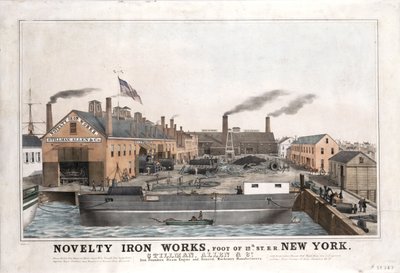 Novelty Iron Works, Stillman, Allen & Co. Stoommachine en algemene machinefabrikanten, voet van 12th Street, East River, New York, ca. 1841-1844(Novelty Iron Works, Stillman, Allen & Co. Steam Engine and General Machinery Manufacturers, foot of 12th Street, East River, New York, ca. 1841-1844 (hand-colored litho))John Ritto Penniman |