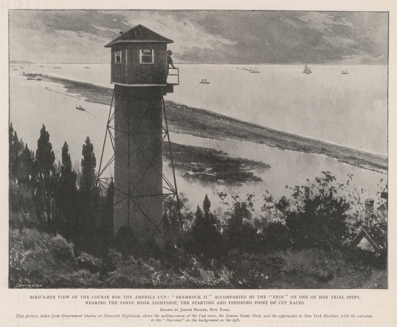Vogelvlucht van de koers voor de America Cup, Shamrock II vergezeld door de Erin tijdens een van haar proefvaarten, nabij de Sandy Hook Lightship, het start- en eindpunt van de Cup-races(Bird's-Eye View of the Course for the America Cup, Shamrock II accompanied by the Erin on One of her Trial Spins, nearing the Sandy Hook Lightship, the Starting and Finishing Point of Cup Races (l)Joseph Becker |