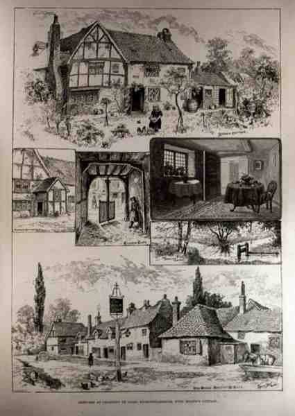 Schetsen in Chalfont St. Giles, Buckinghamshire, met Miltons Cottage(Sketches at Chalfont St. Giles, Buckinghamshire, with Miltons Cottage, from The Illustrated London News, 4th June 1887 )Louis Wain |