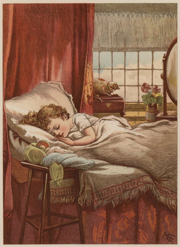Kind slaapt in bed(Child asleep in bed (chromolitho))Mary Ellen Edwards |