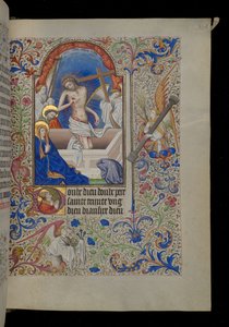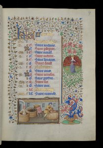 Voorstelling van Adam die de aarde bewerkt en Eva die wol spint na hun verdrijving uit het aardse paradijs. Miniatuur uit “Des cas des nobles hommes et femmes infortunes” (De casibus) door Giovanni Boccaccio, ook wel Jean Boccace (1313-1375), Italië(Representation of Adam picking the earth and Eve spinning the wool after being hunted from the earthly Paradise. Miniature taken from “” Des cas des nobles hommes et femmes infortunes”” (De casibus) by Giovanni Boccaccio dit Jean Boccace (1313-1375), Itali)Master Dunois |