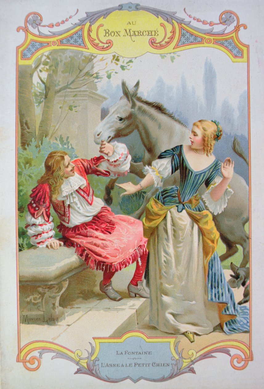 De ezel en de kleine hond, uit Fabels van Jean de La Fontaine, reclame voor Au Bon Marché warenhuis(The Donkey and the Little Dog, from Fables by Jean de La Fontaine (1621-95), advertising for Au Bon Marche department store )Maurice Leloir |